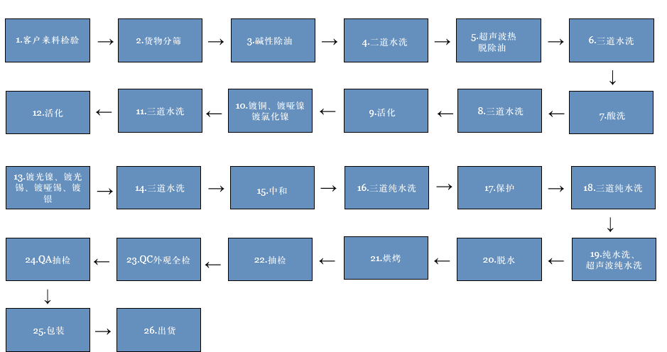 精密電鍍金(厚金、薄金);化學(xué)金;鍍銀(厚銀、薄銀);鍍銅(酸銅、堿銅、焦銅);化學(xué)沉鎳(中磷、高磷);電鍍鎳(可焊性鎳);亮鎳、啞鎳、半光鎳、氨基磺酸鎳);高溫鍍錫(啞錫、亮錫);化學(xué)沉錫;清洗鈍化;專業(yè)電鍍盲孔、深孔等高難度產(chǎn)品...